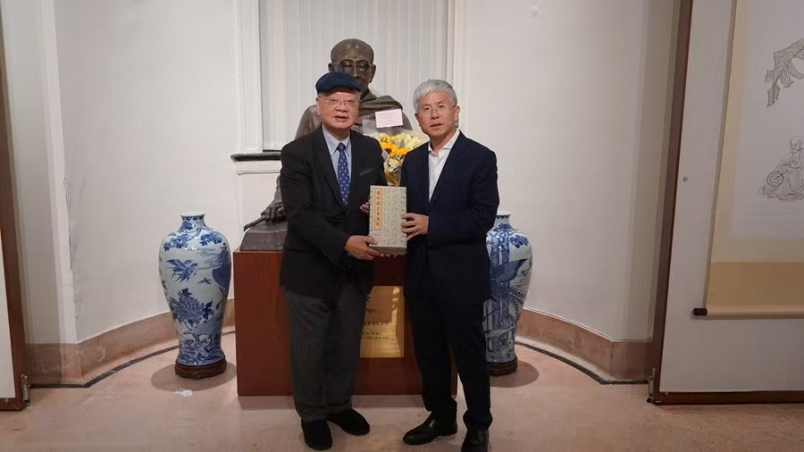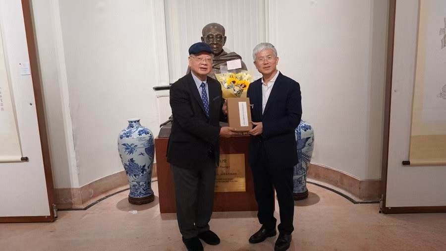 李术才代表山东大学向饶宗颐塑像敬献鲜花,并在嘉宾留言簿上题词“道德文章垂不朽,清风雅量著平生”。李术才向饶宗颐学术馆和饶学联汇赠送《山东省城试办大学堂暂行章程》《周氏师古堂法帖》和近年学校人文社科领域代表性研究成果。李焯芬向李术才赠送饶宗颐先生《眼底山川》《海上因缘》书画集。