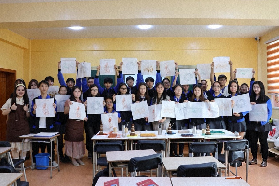 在达尔罕乌拉省彩虹中学,代表团与校长宾巴巴特尔进行座谈。山大派驻该校的国际中文教育志愿者教师代表介绍中文教学开展情况,各年级学生做中国语言文化学习成果展示。双方共同为“国际学生生源基地”揭牌,该校毕业生、山大在读本科生明月线上介绍了山东大学的学习生活情况,代表团为该校学生讲授关于雕版印刷的文化体验课程。