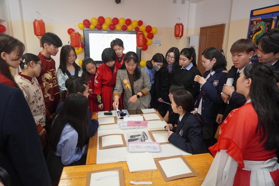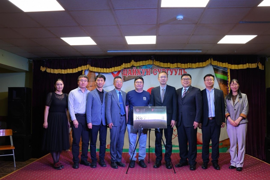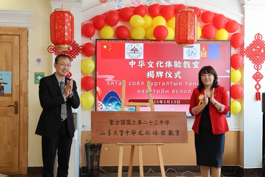 在蒙古国立23中学,双方举行“山东大学中华文化体验教室”揭牌仪式,代表团为当地师生讲授“文明传承—汉字甲骨文生肖拓片体验”文化课程,并面向全校中文学习者开展“留学中国”山大品牌招生宣讲,中文班学生精心准备了中国文化节目。蒙古国立23中学校长奥云苏云出席活动。