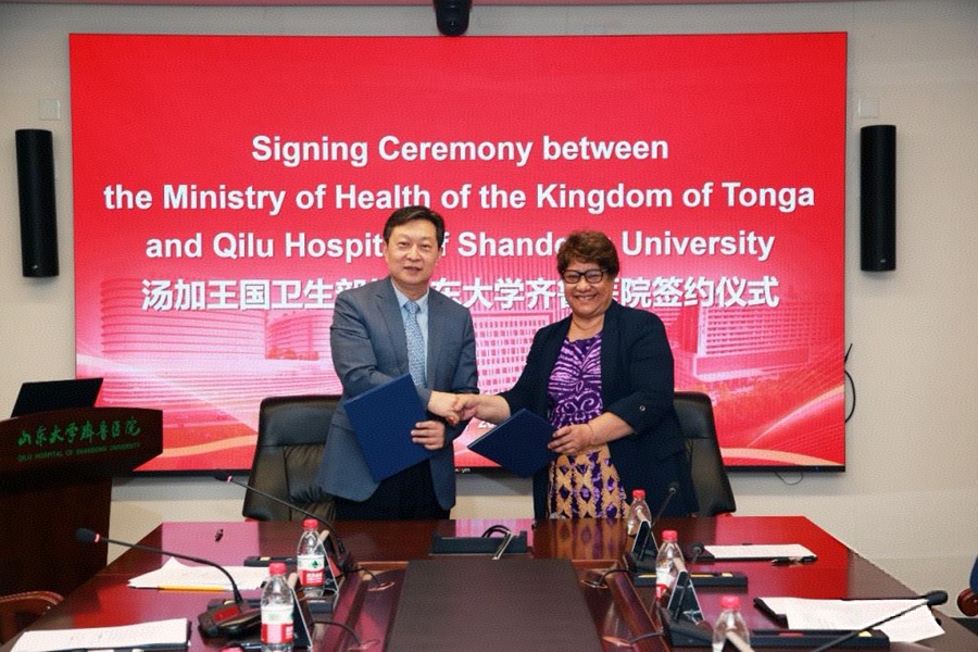 在签约仪式上,齐鲁医学院党工委书记、齐鲁医院党委书记陈鑫与安娜·阿卡乌奥拉分别代表双方签署“汤加卫生部与山东大学齐鲁医院合作谅解备忘录”。