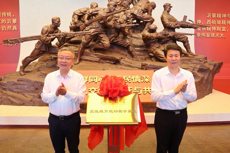 仪式后,山东大学一行前往沂蒙革命纪念馆,任友群、张宝亮共同见证山东大学党性教育现场教学基地落成。