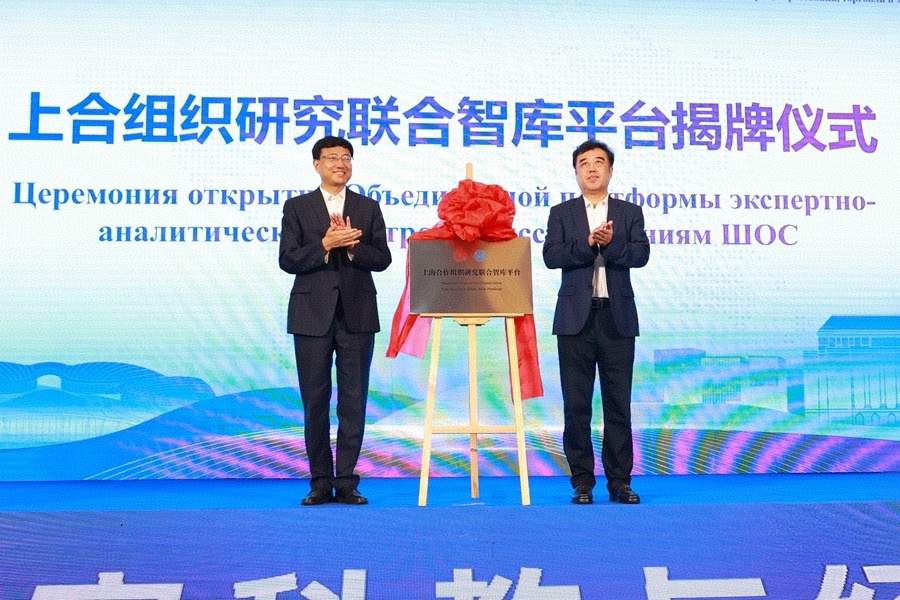 李刚,山东大学校长助理、青岛校区党工委书记邢占军为“上合组织研究联合智库平台”揭牌。