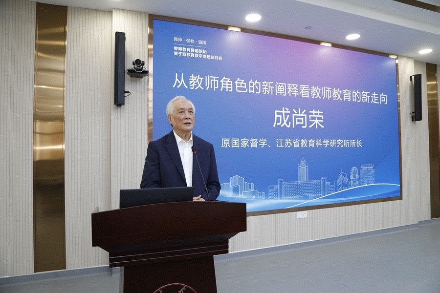 原国家督学、江苏省教育科学研究所所长成尚荣以“从教师角色的新阐释看教师教育的新走向”为题作主旨报告。他表示,教师要努力成为终身学习者、反思型实践家、儿童研究专家,把道德教育、思想政治教育有机融入到学科教育教学过程中。