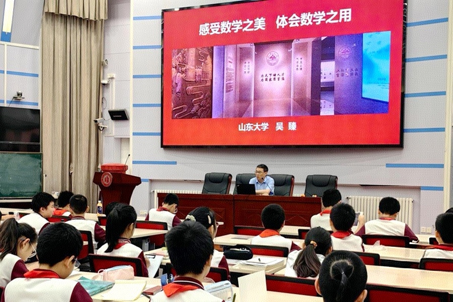 活动中,吴臻为华东师范大学第二附属中学“丘成桐少年班”学生主讲第二期“致知讲堂”,作“感受数学之美,体会数学之用”科普报告。他结合人工智能、信息安全、经济金融等前沿应用,阐述了数学学科的核心价值与时代意义,激励同学们夯实基础、勇于探索,未来服务国家战略需求。上海市拓展组负责人为控江中学师生详细解读了山东大学招生政策。