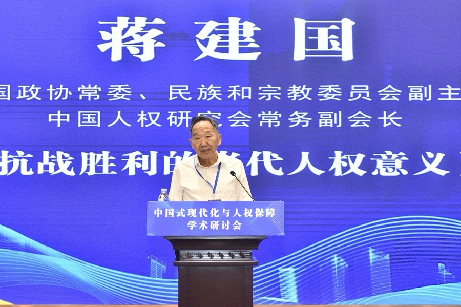 蒋建国表示,中国人民抗日战争是为国家生存而战、为民族复兴而战、为人类正义而战的伟大胜利,捍卫了中国人民的生存权,拓展了中华民族的发展权,促进了人类社会的和平权。抗战胜利展现了中国共产党和中华民族追求民族独立、自由与解放的不屈意志,为拯救人类文明、保卫世界和平、推进人权事业作出重大贡献。
