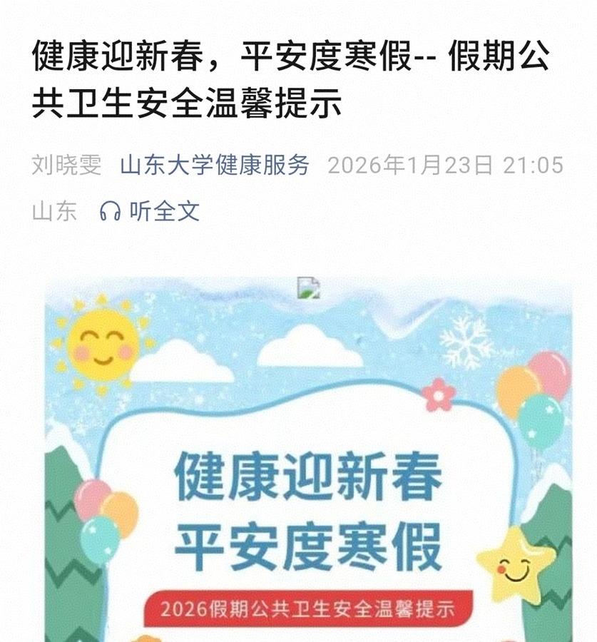 科普防控双发力,筑牢健康防护屏障。聚焦寒假期间健康风险防控重点,校医院精准开展健康宣教与防控排查工作,全方位守护师生健康。通过师生医疗咨询群、官方公众号等渠道,发布《健康迎新春平安度寒假》等公共卫生提示,普及传染病预防、冬季养生、应急处置等健康知识,引导师生树立科学健康理念,做好自我防护;建立健康监测反馈机制,严密排查重点传染病隐患,明确专人负责异常情况上报与处置,做到早发现、早报告、早处置,全力防范各类健康风险。
