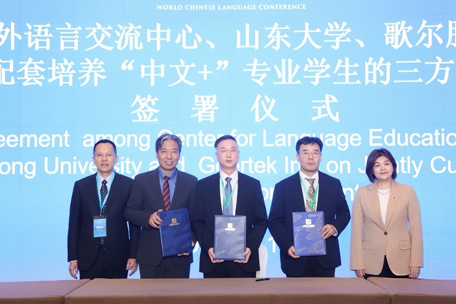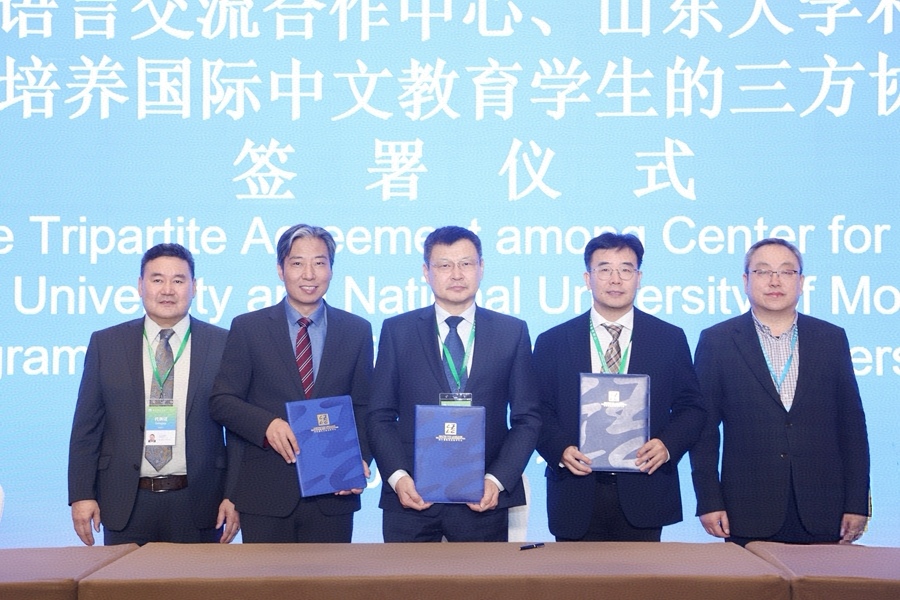 在国际中文教育相关协议签署暨授牌活动现场,山东大学与教育部中外语言交流合作中心,以及蒙古国立大学、歌尔股份有限公司签署合作协议,联合培养本土中文教师,促进“中文+专业”海外人才培养。